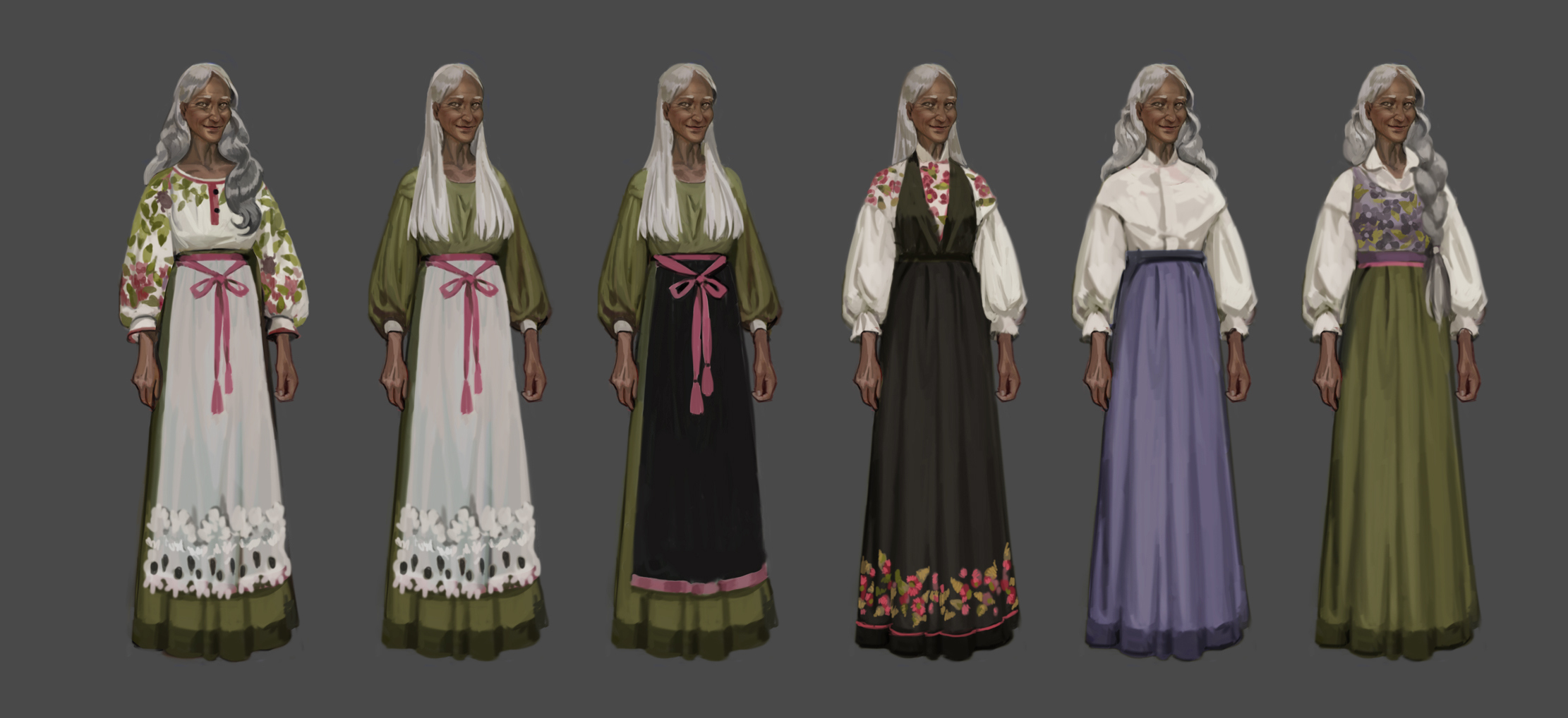After I’ve read the profile, I do concepting: I come up with a simple pose for the character, then dress them up in different ways. Usually about half a dozen or so? Their clothes often say a lot about what they do in the village, their social station, how they live, and who they are.
