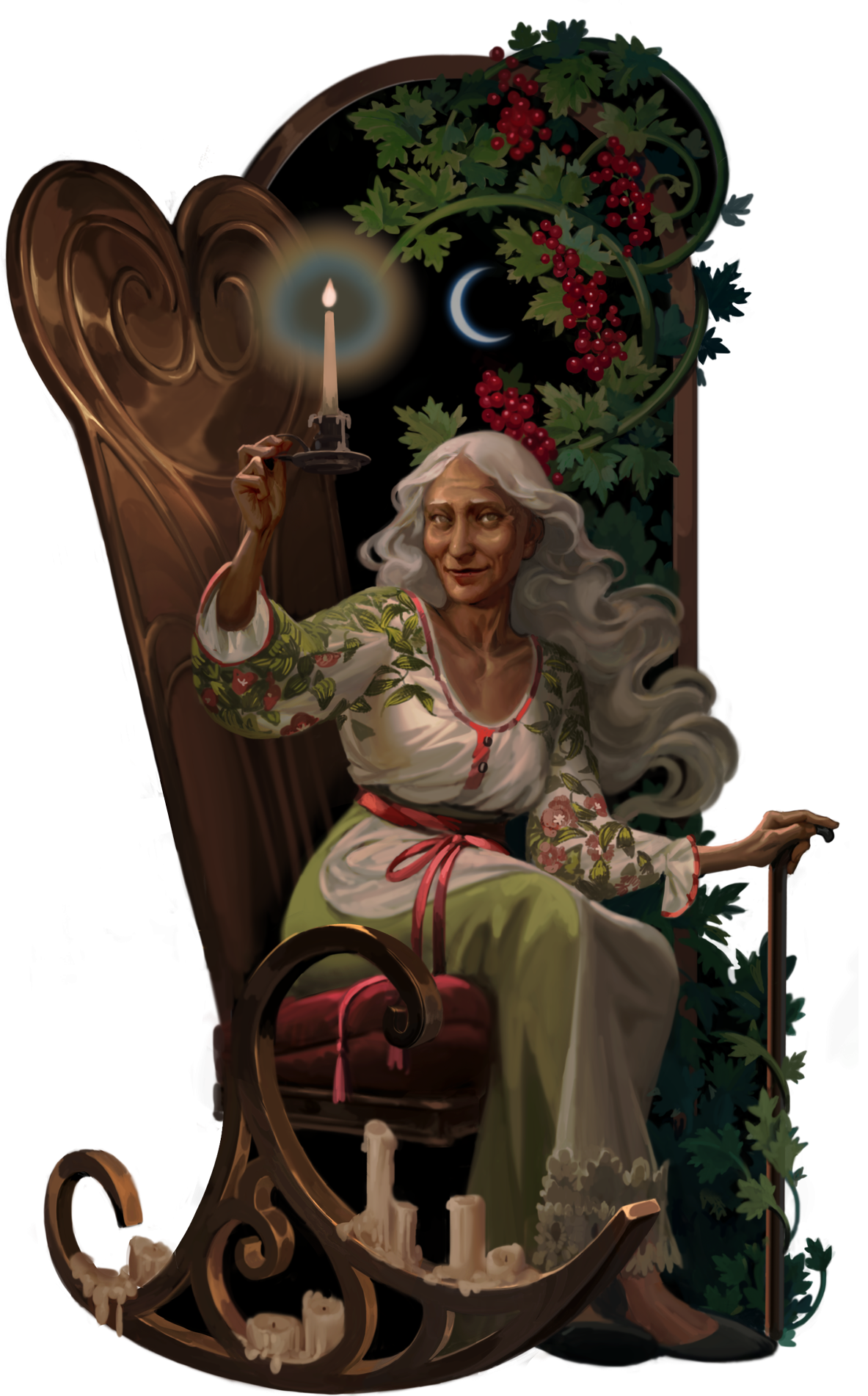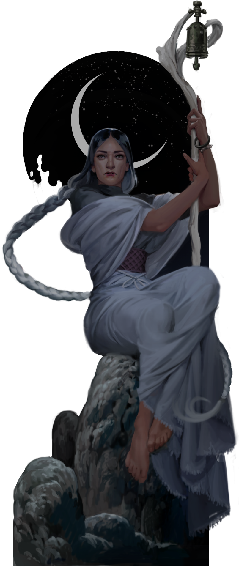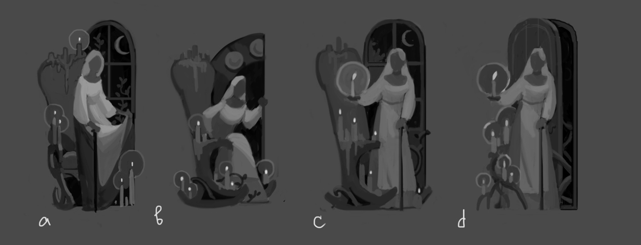 Chris: Yes, she lives away from the village, and has a more mystical background. The moon is a very important part of her story, hence its presence in the background, and I love how you’ve drawn it – that single simple sliver of white. I love her staff and its bell, too. There’s so much specific lore in this image, which will all pay off when people play the game.
