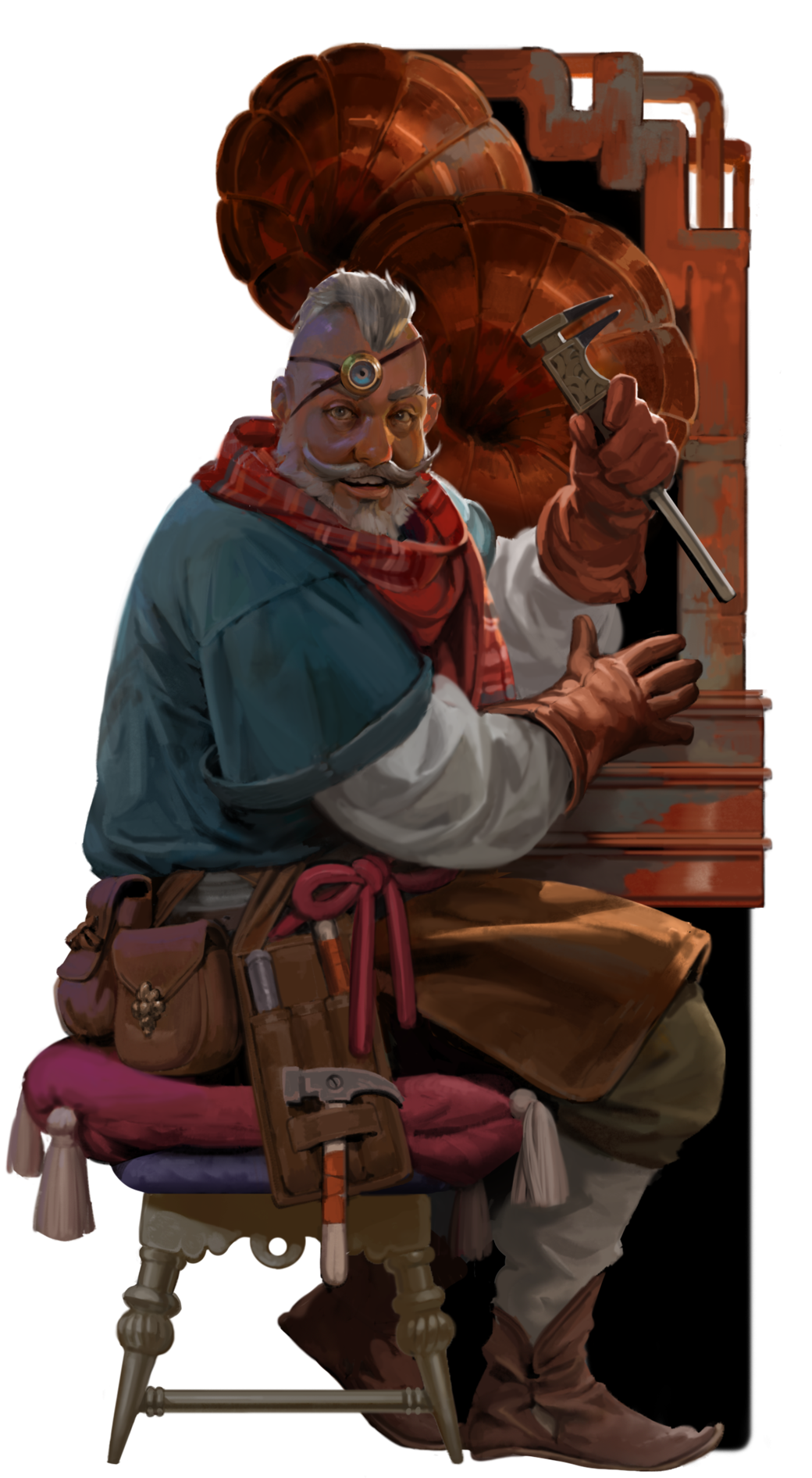 In this illustration I gave him his sitting pose, as if he was working, and added the machinery in the background. That’s his chorophon. Because it’s not something you might expect in a fantasy setting, we wanted to make it a prominent feature when you spoke to him.