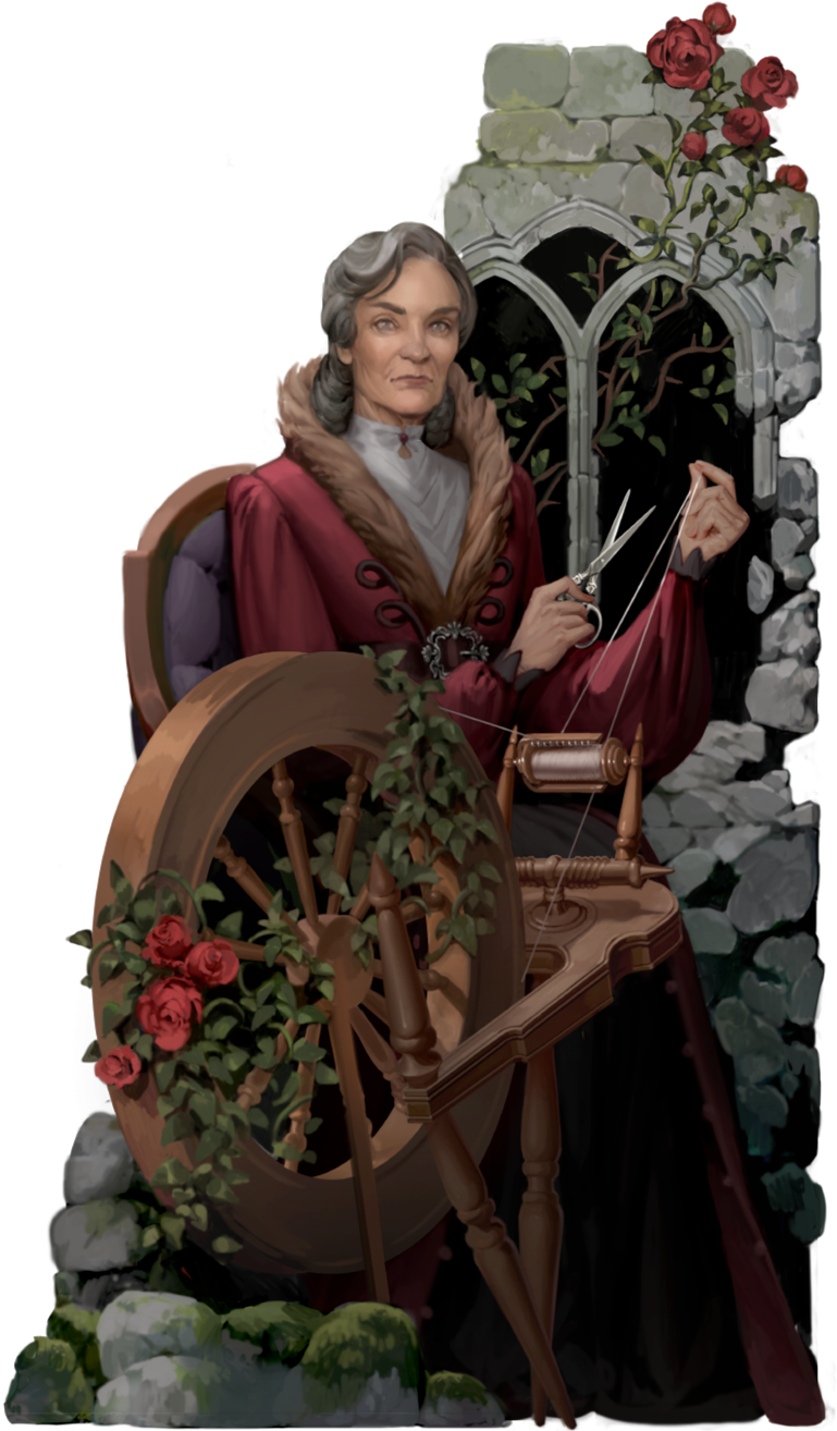 I also like her pose – the gesture she’s making with the thread and the scissors. It feels powerful, fitting her role as matriarch of the family. It recalls the Fates, and cutting the life-threads of mortals – which isn’t a direct inspiration, but again speaks to that sense of power.