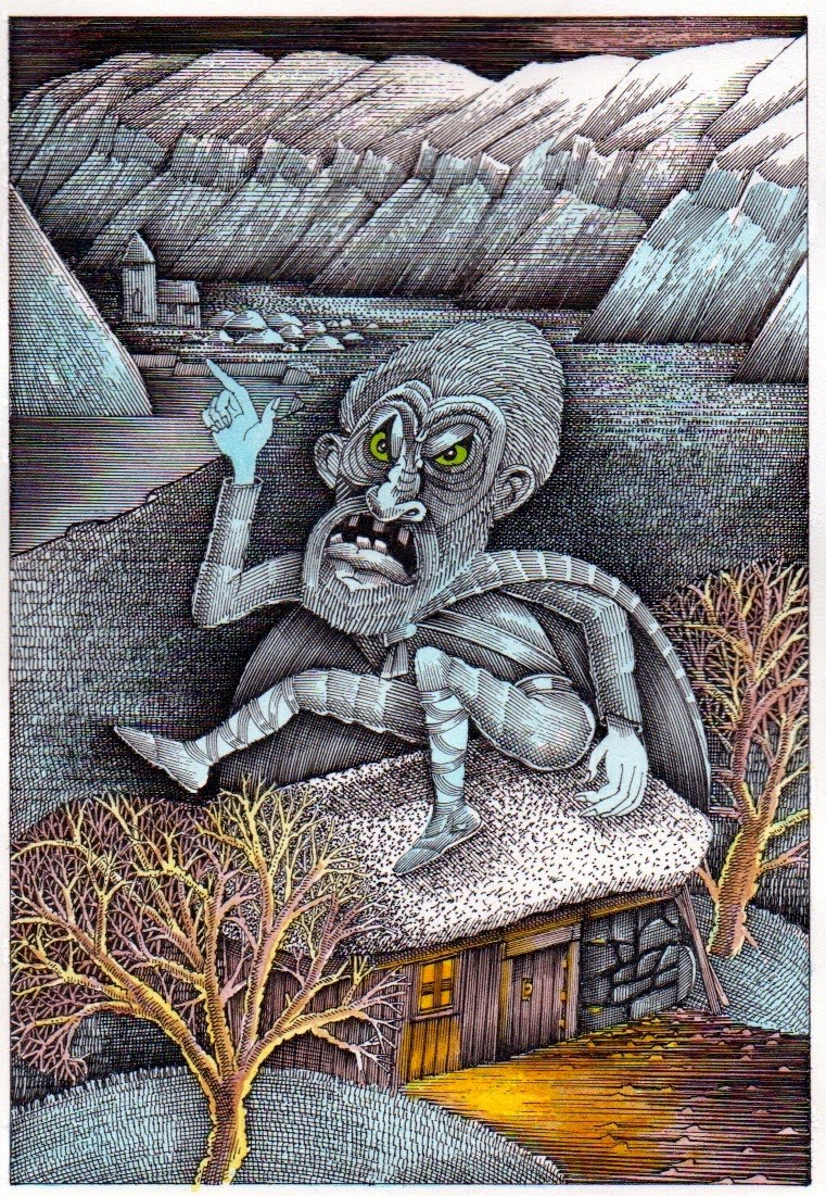 Glam sat astride a roof beating it furiously with his hands, an illustration by John Vernon Lord from the 'Grettir's Saga' in Icelandic Sagas, Volume 2, The Folio Society, 2002.