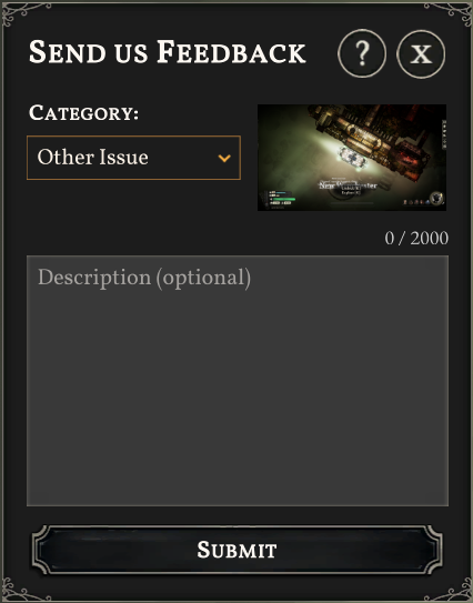 Sunless Skies has an in-game bug reporting tool which is accessible by pressing F8, or via the Report A Bug button on the Pause Menu (press Esc or click the Cog icon on the HUD).
